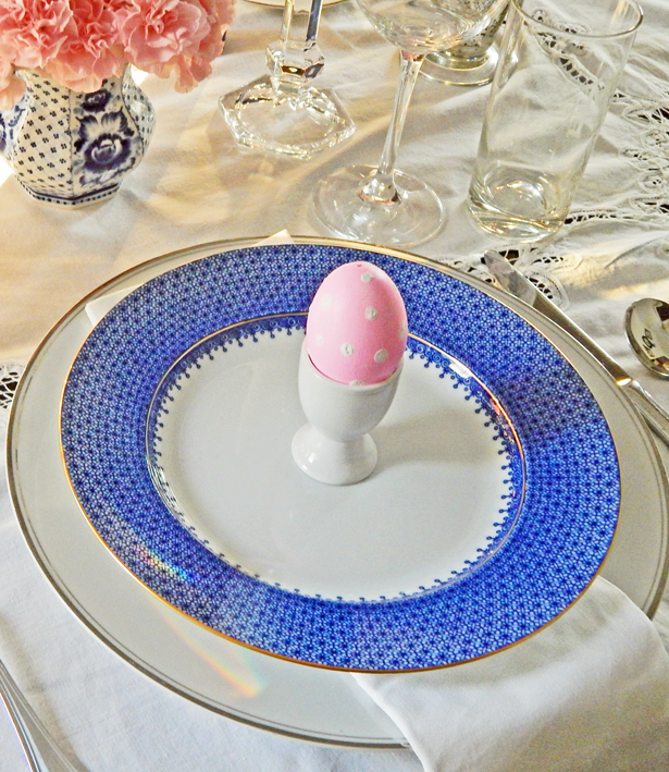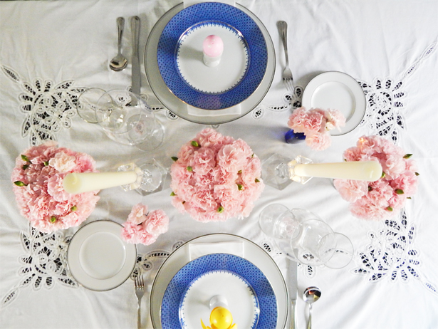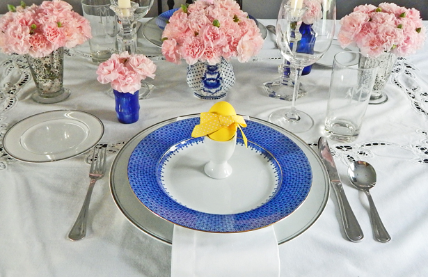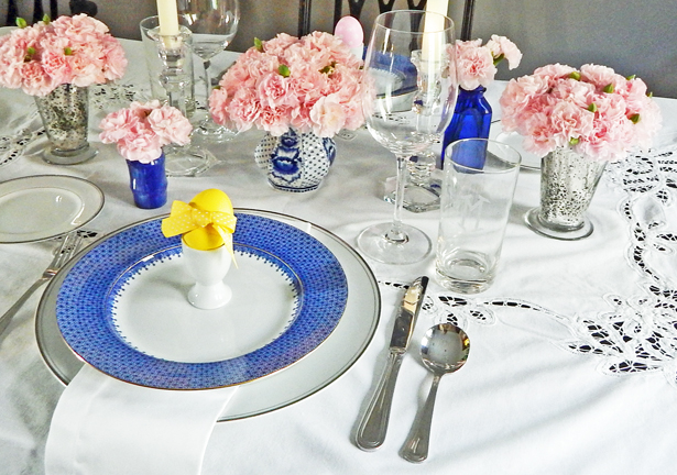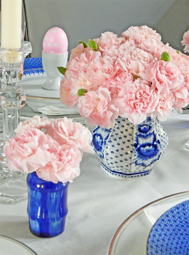 Easter is the perfect opportunity to bring spring into my house. I couldn’t resist these luscious pink carnations at the grocery store last week, and so I decided to create my Easter tablescape around them. I’m not usually a fan of carnations (I think overuse in prom corsages ruined these lovely little flowers), but pairing these with a blue and white color combo is cheery and evocative of spring without being overly pastel and kitschy.
