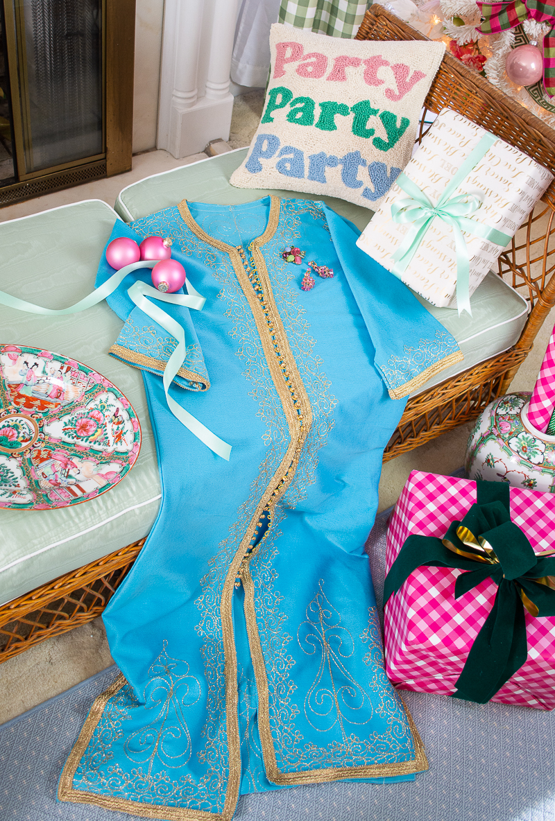 Have a glamorous fashion loving grandmillennial on your gift list? This vintage caftan in aqua with gold detailing will absolutely delight her!