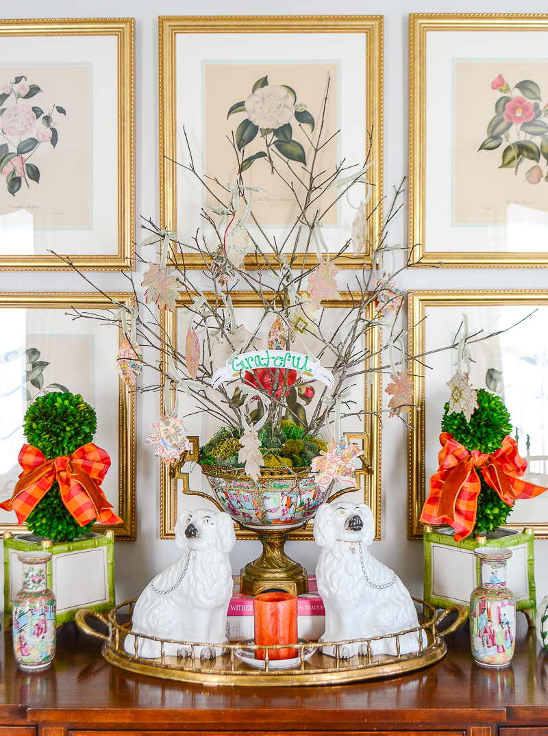 The gratitude tree really makes a statement on the sideboard in our living room. You could create a smaller version for a table centerpiece at Thanksgiving or put in the middle of your entry table for a November decoration.