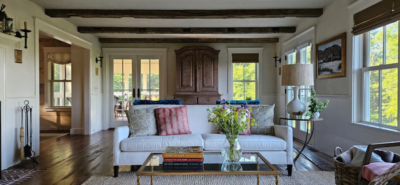 If you are able to replace flooring or countertops, choose the natural option and think about how different surfaces can add interest to the look and feel of a space. Check out this new construction living room from designer Alexandra Eidenschenk. Note the varied natural textures: wood, jute, bamboo, brick. The textured and paneled walls. The beams. The beautiful casings! This space does not feel new or monotonous even with cream walls.