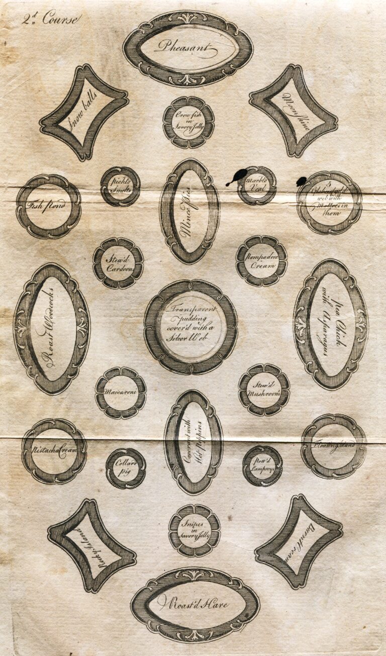 Directions for a Grand Table, 2nd Course by Elizabeth Raffald, The Experienced English Housekeeper (Manchester: Printed by J. Harrop, 1769)