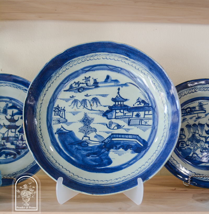 It was truly all the rage to have “China” plates on the table whether they were custom ordered with monograms, heraldic devices, symbols of the new nation like the eagle or made to order patterns like blue Canton. Between 1784 and 1846 as many as 40 US ships a year voyaged to China for trade. The largest shipment of porcelain on record carried 5,800 piculs of porcelain. One picul “pikle” equates to about 130 pounds, so if we do the math that’s about 750,000 pounds of porcelain. If you figure a dinner plate might weigh 6-8 ounces or so…that’s a lot of dishes!