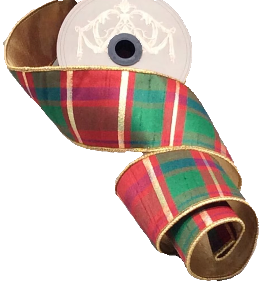 A gorgeous plaid ribbon in red, gold, green, with just a hint of purple and blue. Gold backing. Wired. 2.5″W