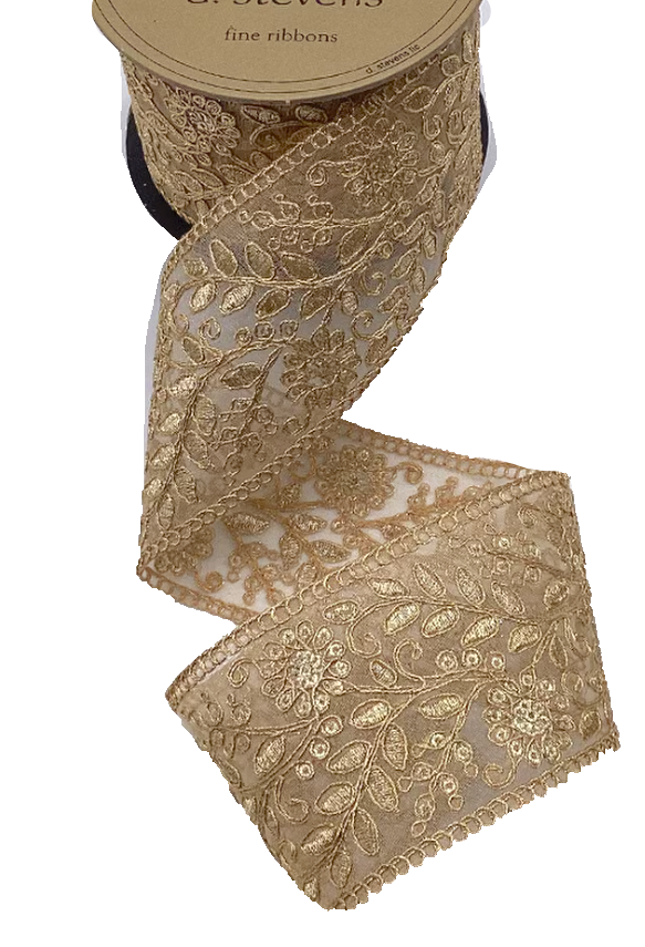 A truly stunning gold embroidered ribbon. Sheer and not wired. 2.5″W