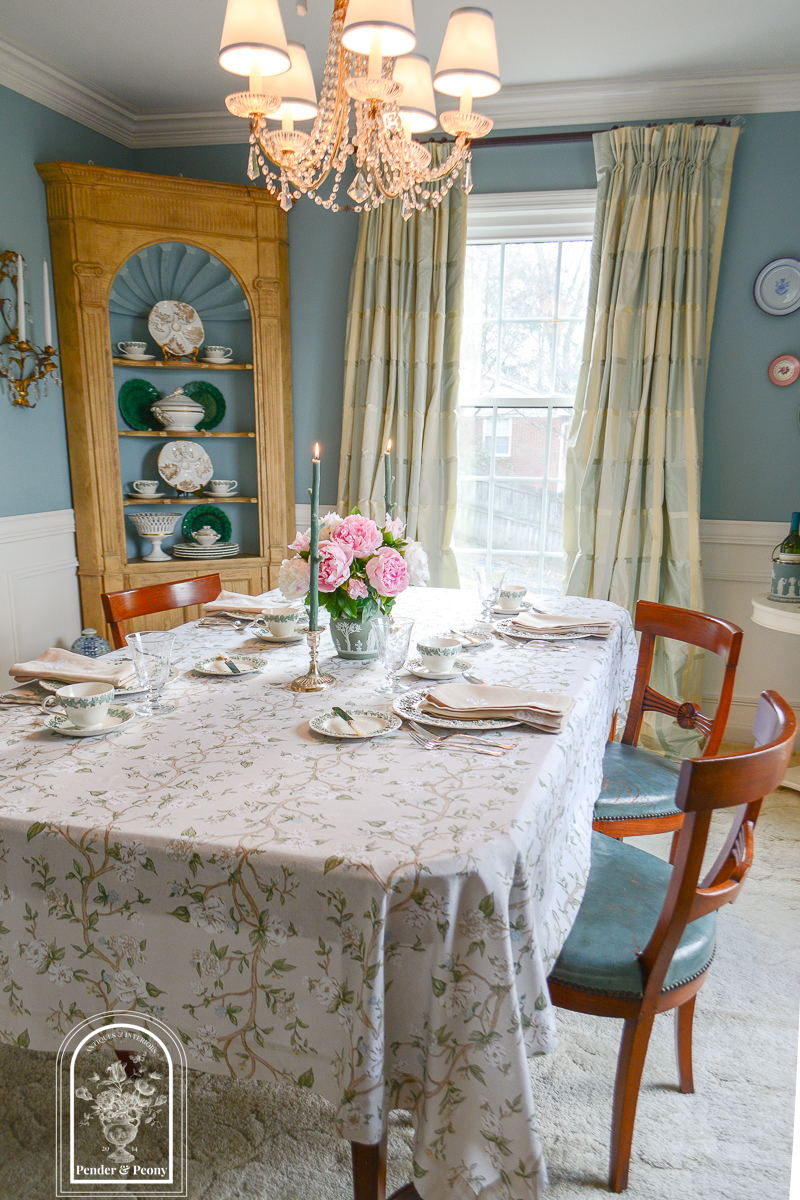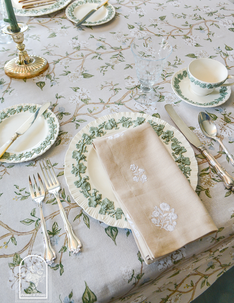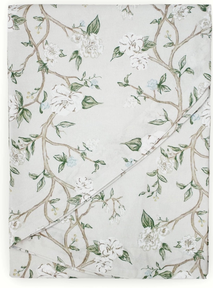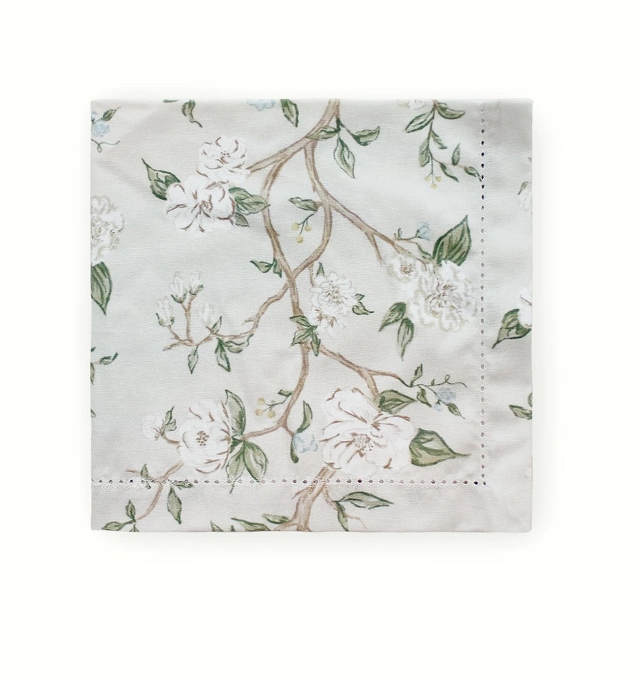These subtle floral linens made from 100% organic cotton are just gorgeous! So elegant! A refined color palette of soft gray, French blue, beige, and sage green. A beautiful pairing for any china or floral centerpiece.