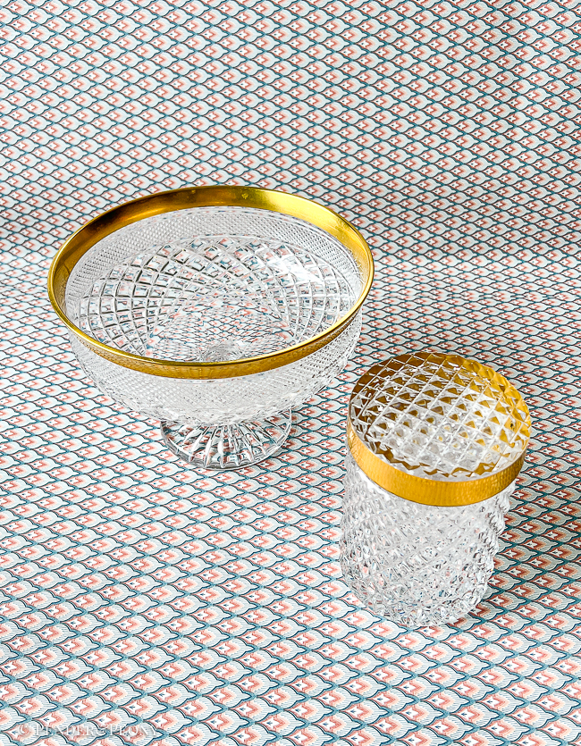 Add some sparkle and shine to your vanity, dresser, or bar with this gorgeous set of German cut crystal pieces. Vintage circa 1960’s. Possibly Victoria pattern. Silesian/Bavarian/German likely Josephinenhuette or Klokotschnik. 24k gold bands.