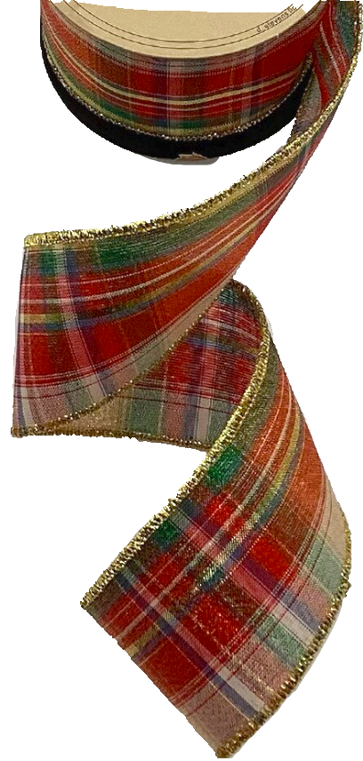 This is a beautiful light weight poplin ribbon with gold shimmer in a classic plaid of red, blue, and green. Wired.