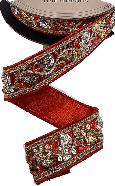 A stunning ribbon in red shimmer with gold and silver sequin embroidery. Wired.